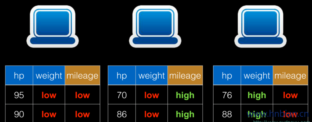 2. 特征装箱(Binning):决策树的构建过程就是对特征的取值不断进行划分的过程,对于离散的特征,如果有 M 个值,最多2^(m-1) -1个划分,如果值是有序的,那么就最多 M-1 个划分。比如年龄特征,有老,中,少 3 个值,如果无序有2^(m-1) -1(((2^3-1)-1) = 3)个划分即 3 种划分:(老|中,少);(老,中|少);(老,少|中);如果是有序的,即按老,中,少的序,那么只有 m-1 个,即 2 种划分,(老|中,少);(老,中|少)。对于连续的特征,其实就是进行范围划分,而划分的点就是 split(切分点),划分出的区间就是 bin。对于连续特征,理论上 split 是无数的,在分布环境下不可能取出所有的值,因此它采用的是(1)中的切点抽样统计方法。如下图采用了不同的切分点之后的标签分类统计。