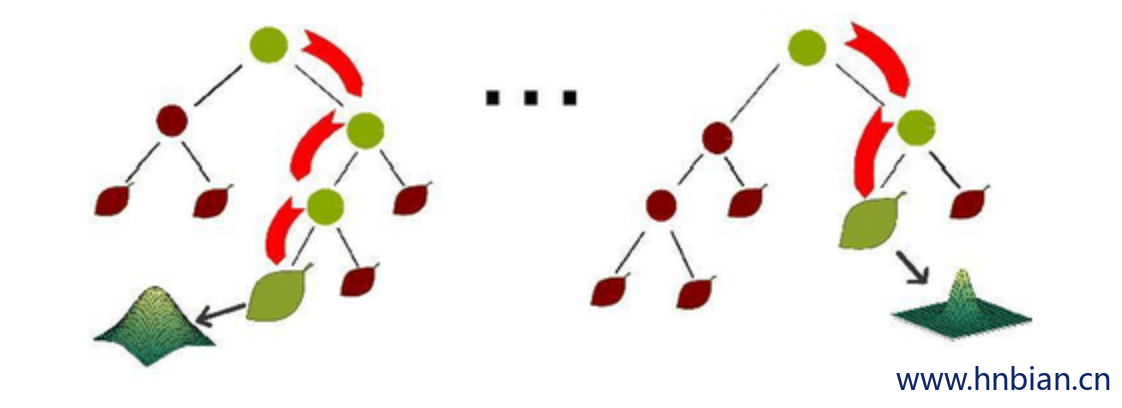 3. 逐层训练(level-wise training):单机版本的决策数生成过程是通过递归调用(本质上是深度优先)的方式构造树,在构造树的同时,需要移动数据,将同一个子节点的数据移动到一起。此方法在分布式数据结构上无法有效的执行,而且也无法执行,因为数据太大,无法放在一起,所以在分布式环境下采用的策略是逐层构建树节点(本质上是广度优先),这样遍历所有数据的次数等于所有树中的最大层数。每次遍历时,只需要计算每个节点所有切分点统计参数,遍历完后,根据节点的特征划分,决定是否切分,以及如何切分。如下图